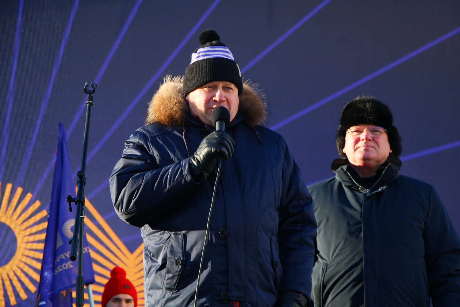 С наступающим Новым годом всех пришедших на праздник поздравили Дед Мороз и Снегурочка. Также с поздравлениями выступил мэр Омска Сергей Шелест.